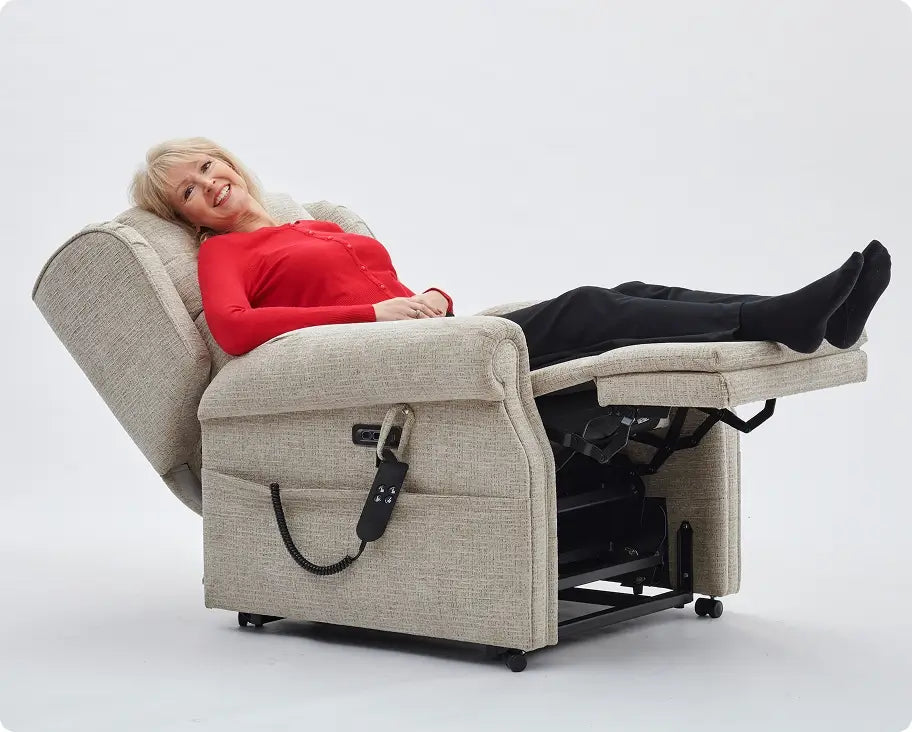 A rise and recline chair (also known as a riser recliner) gently tilts and raises to help you stand up safely and smoothly - perfect for anyone who values independence, comfort, or extra support at home. At the touch of a button, you can adjust your position to relax, read, or nap in total comfort.